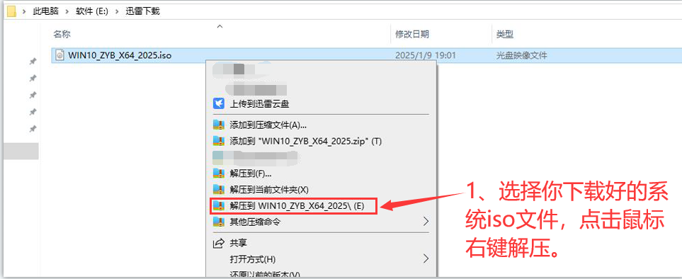 一、使用压缩软件→右键解压已下载的ISO文件到非系统盘(如下图:E\迅雷下载)外的其他盘符目录下;