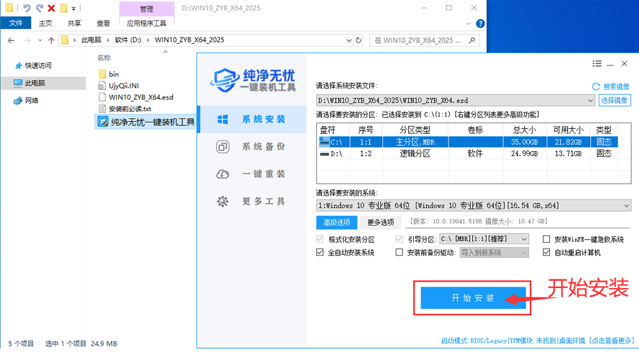 设置U盘为第一启动项,启动进入PE,运行桌面上的“安装系统”,即可进行镜像全自动的安装。