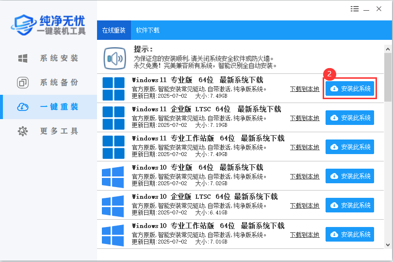 下载软件完软件后,正常打开("纯净无忧一键装机工具"),①点击【一键重装】。如下图所示